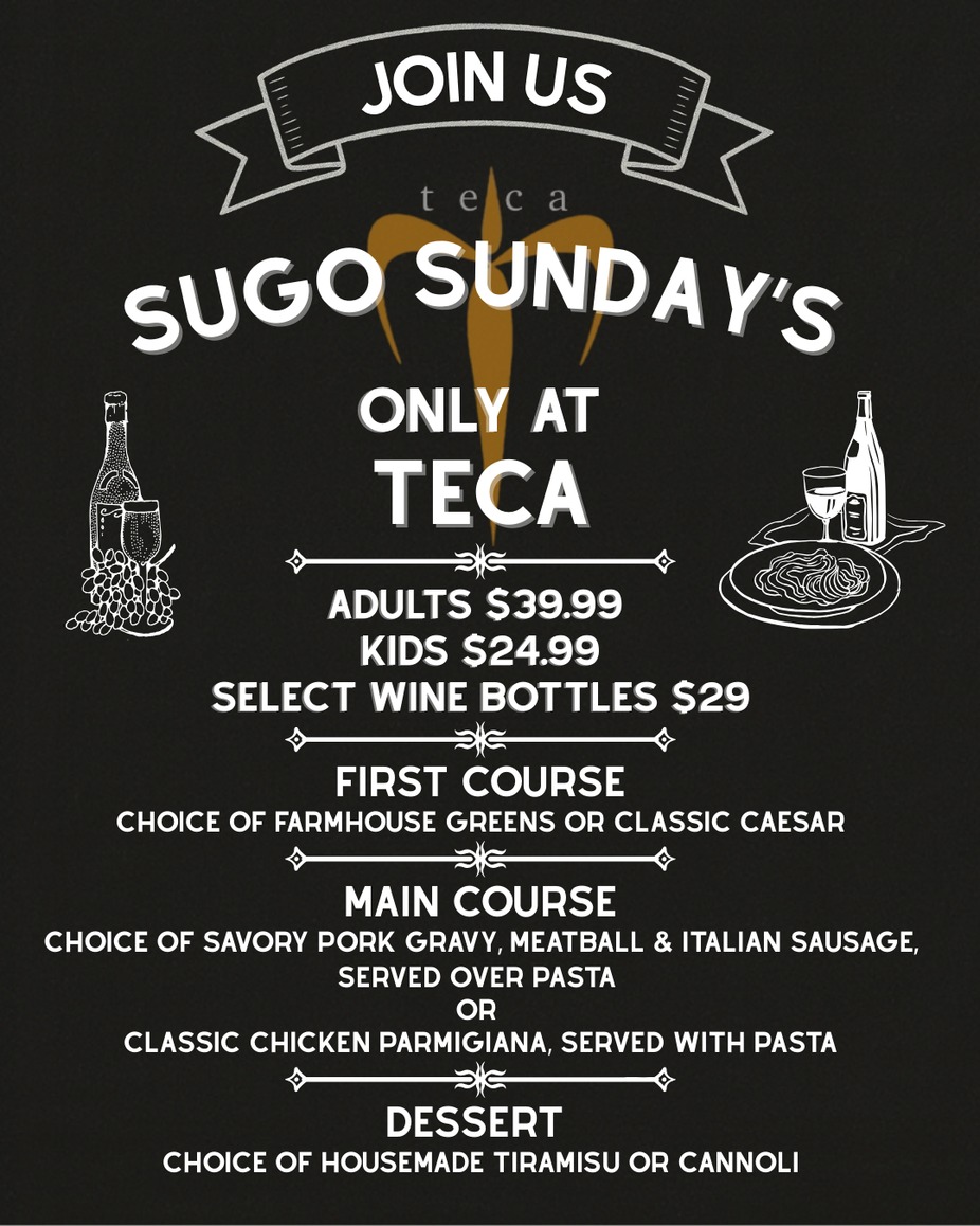 Want to take the family out and not break the bank? Join us for Sugo Sunday's! $39.99 for adults & $24.99 for kids! $29.00 select wine bottles!