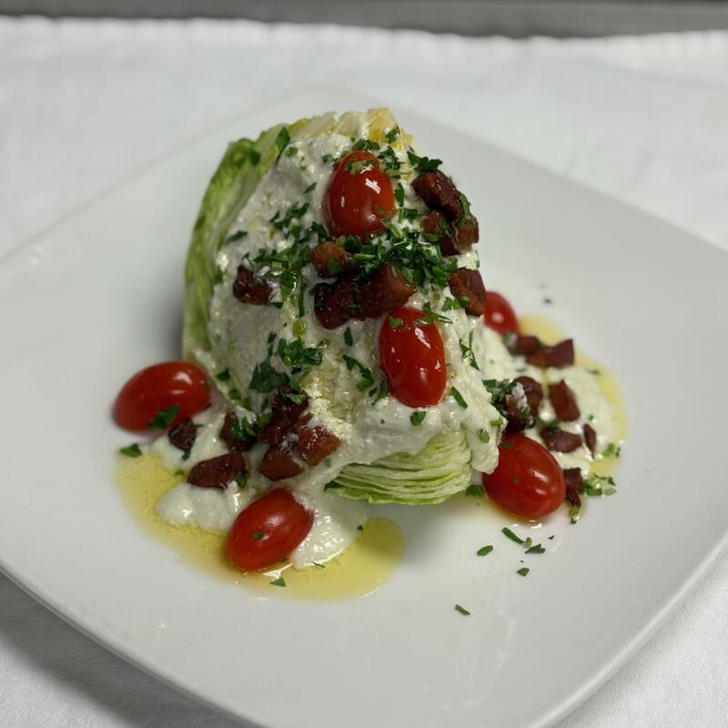 iceberg lettuce, blue cheese dressing, crispy pancetta and cherry tomato, gorgonzola crumble